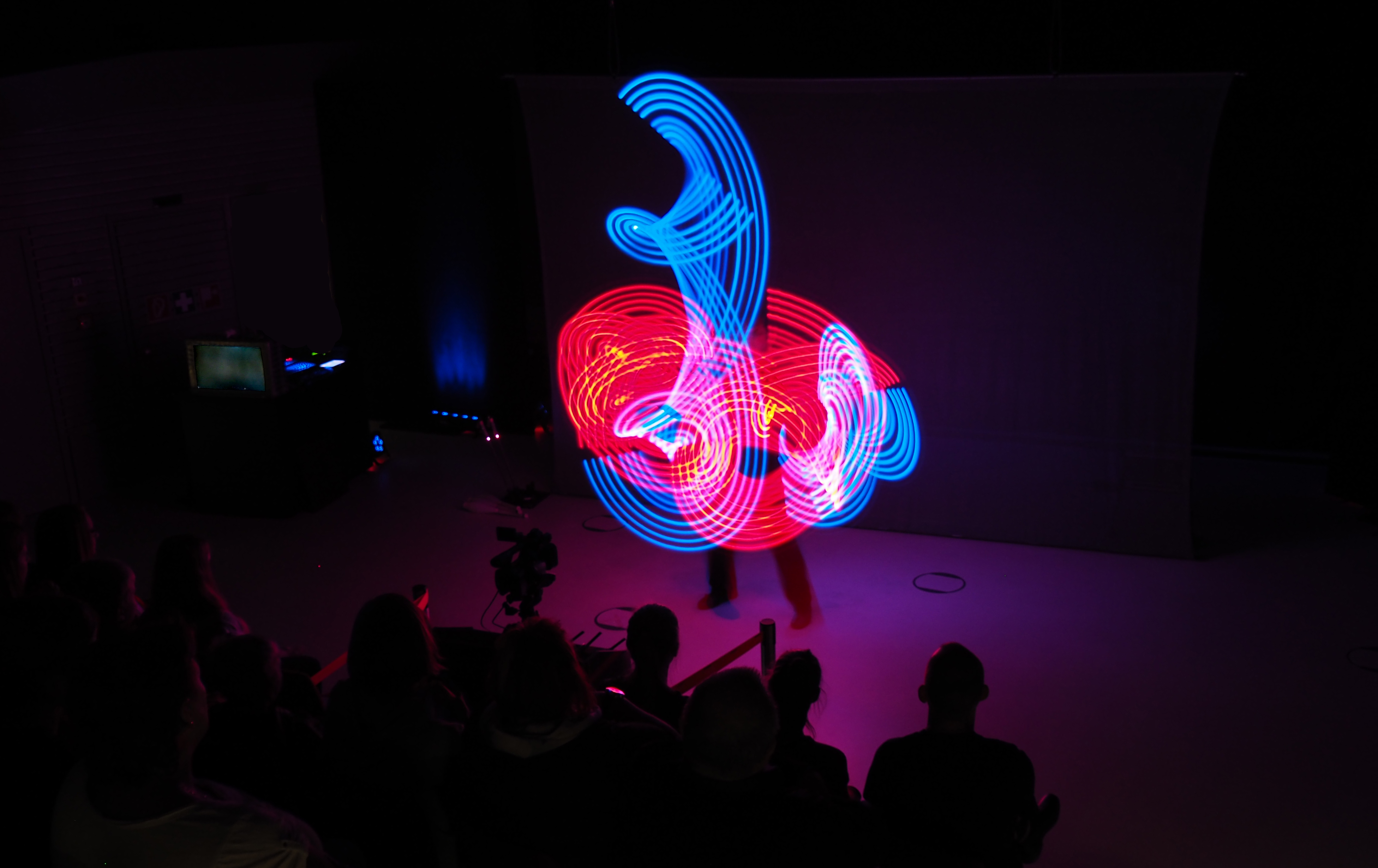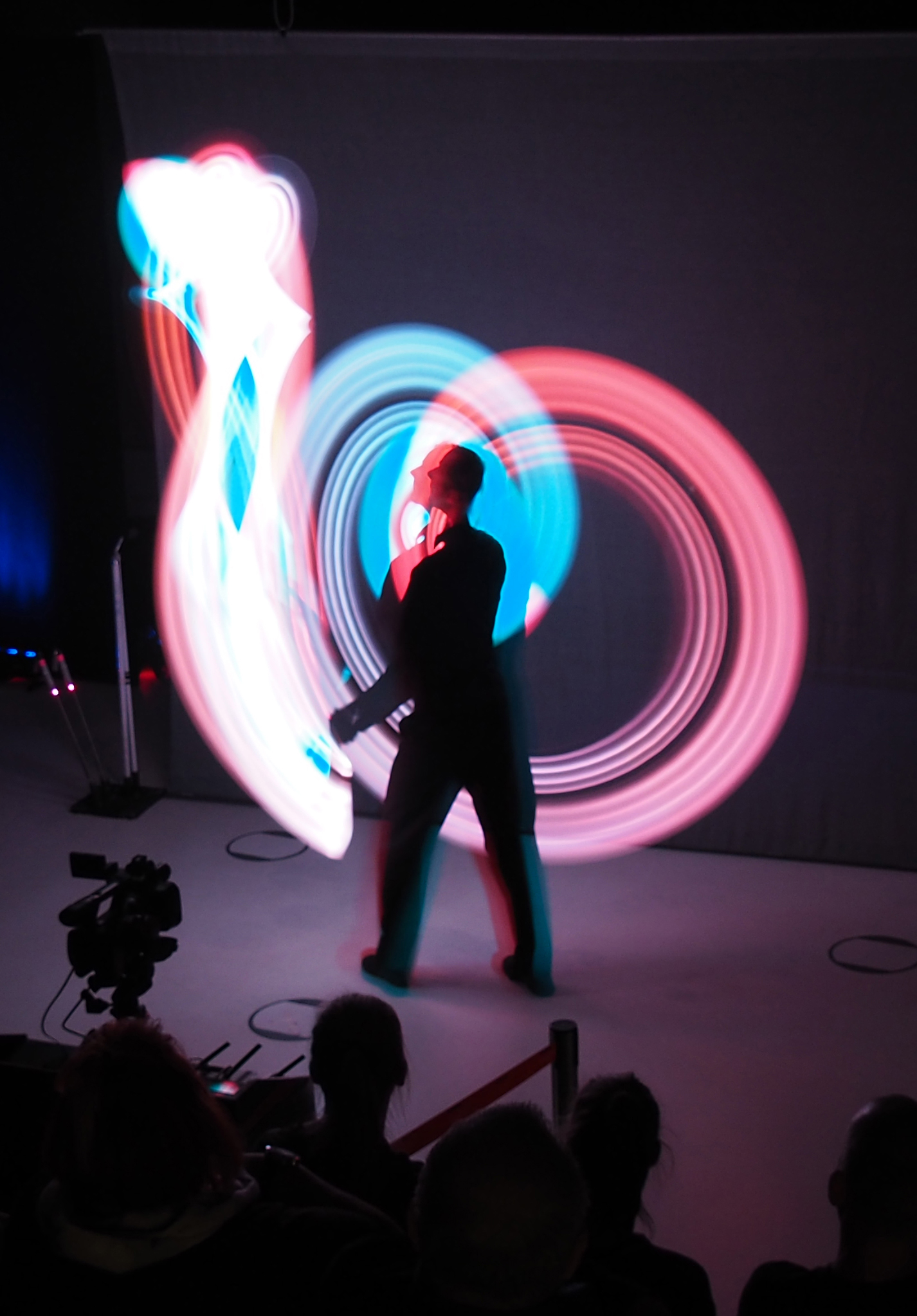 Eine Verbindung aus moderner LED-Jonglage mit Live-Video-Lightpainting, multimedia Effekten und kurzweiligen Erklärungen der dahinter stehenden Techniken, Effekte und wissenschaftlichen Phänomene, wie z.B. die "Trägheit des Auges", "Prinzip der Animation", uvm.